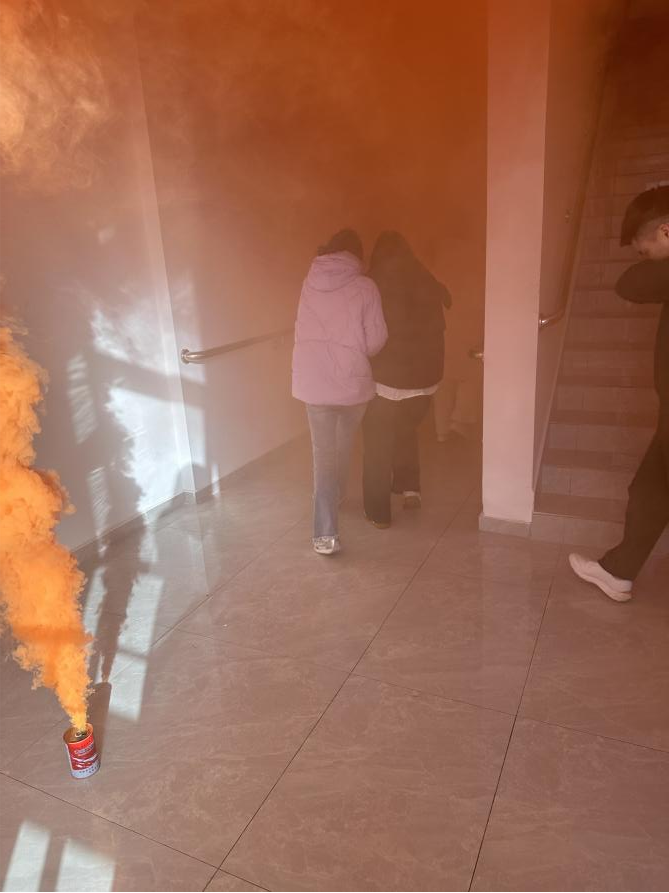 下午3时,随着烟雾弹的点燃,消防警报骤然响起,演练正式拉开帷幕,图书馆模拟火情发生,现场浓烟弥漫。工作人员立即按预定预案组织现场读者有序撤离,大家全程捂鼻低姿前行、彼此照应,沿清晰的安全通道标识从安全出口撤离,有效保障了演练的高效与安全。